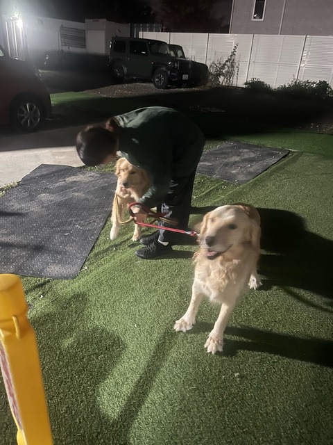 今夜は寒く無くて丁度良い気候ですね~??私達はお姉ちゃん達と遊んで上げ様と思います。二人とも良い子にしてね!リードが絡まない様にして下さいね。···
